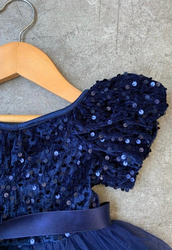 Brillo, vuelo y encanto. El vestido Ciara combina lentejuelas, tul vaporoso y un moño de satén para un look de fiesta inolvidable. ¡Perfecto para que tu pequeña deslumbre con este tono Azul noche.