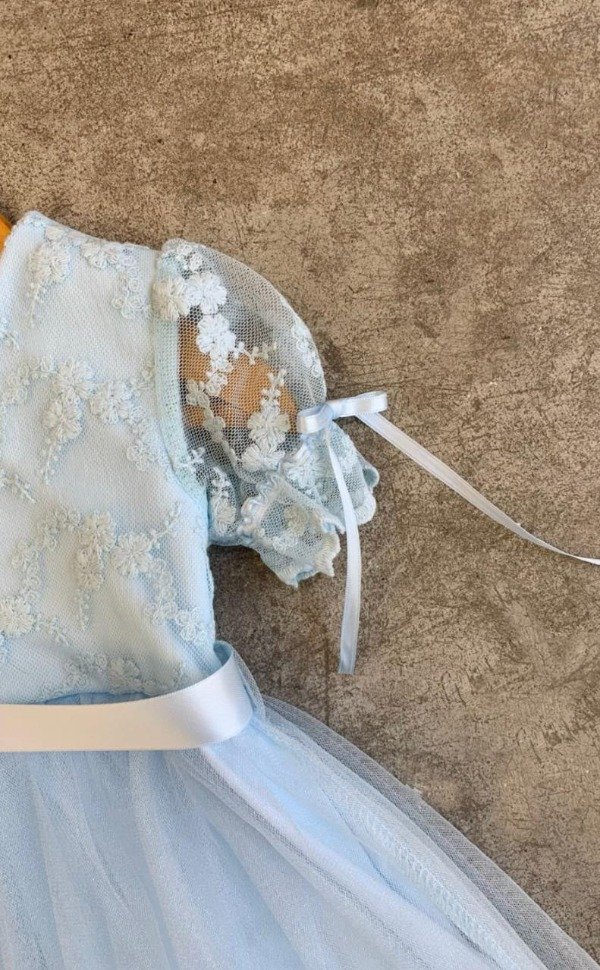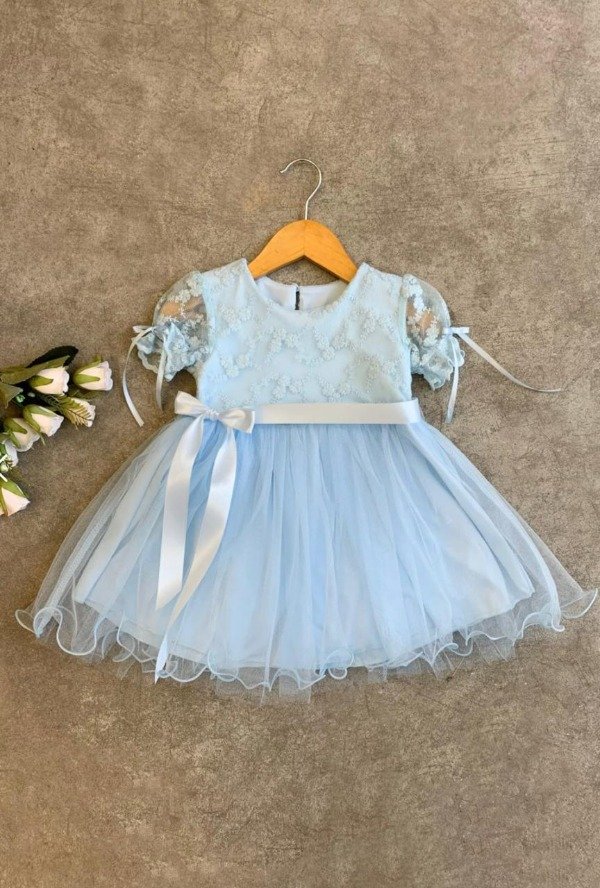 Una opción delicada y encantadora para ocasiones especiales. Con cuerpo bordado en flores, mangas de tul con lazos y una falda con vuelo en tul suave. El moño de raso aporta el toque final perfecto. Disponible en tonos naturales y también en una dulce versión celeste. Ideal para bautismos, cumpleaños o eventos familiares.