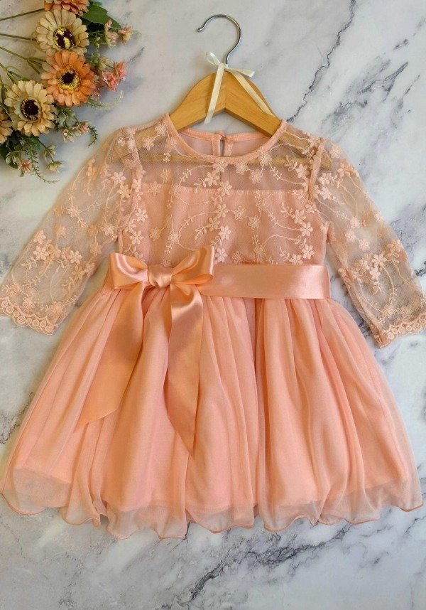 Delicado, elegante y lleno de encanto. Este vestido en tono rosa o natural suave, es ideal para ocasiones especiales como bautismos, cumpleaños o eventos familiares. Su parte superior de encaje bordado con flores aporta un aire romántico, mientras que la falda de gasa aporta movimiento y ligereza. El lazo de satén completa el look con un toque de distinción.